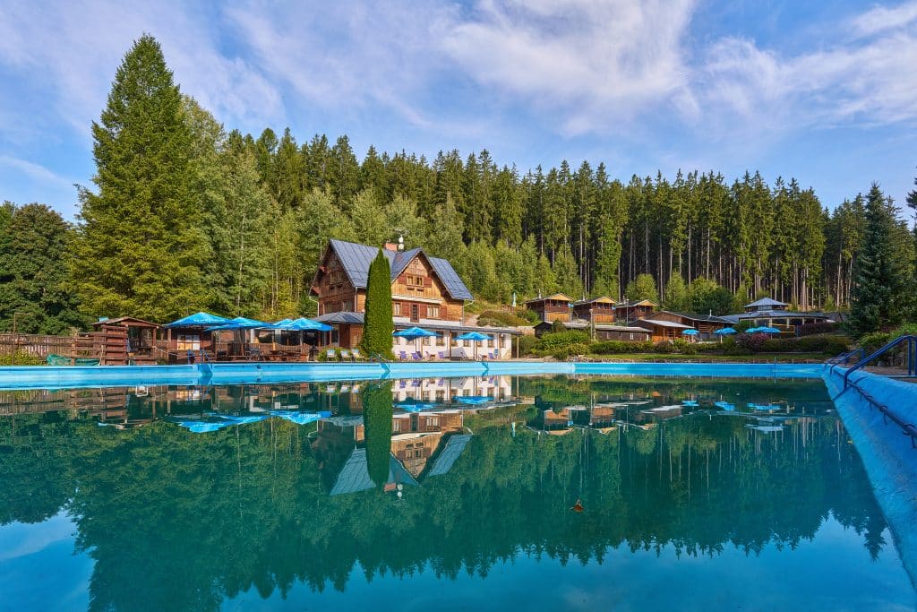 Na okraji lesa, v srdci Krkonošského národního parku, se rozprostírá náš 50metrový bazén napájený čistými horskými prameny. Voda, která sem přitéká, je známá svou výjimečnou čistotou a jemností – bezpečná i pro tu nejcitlivější pokožku.