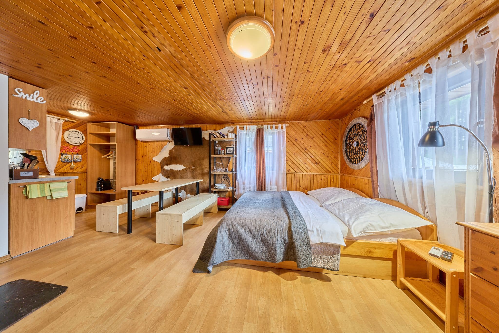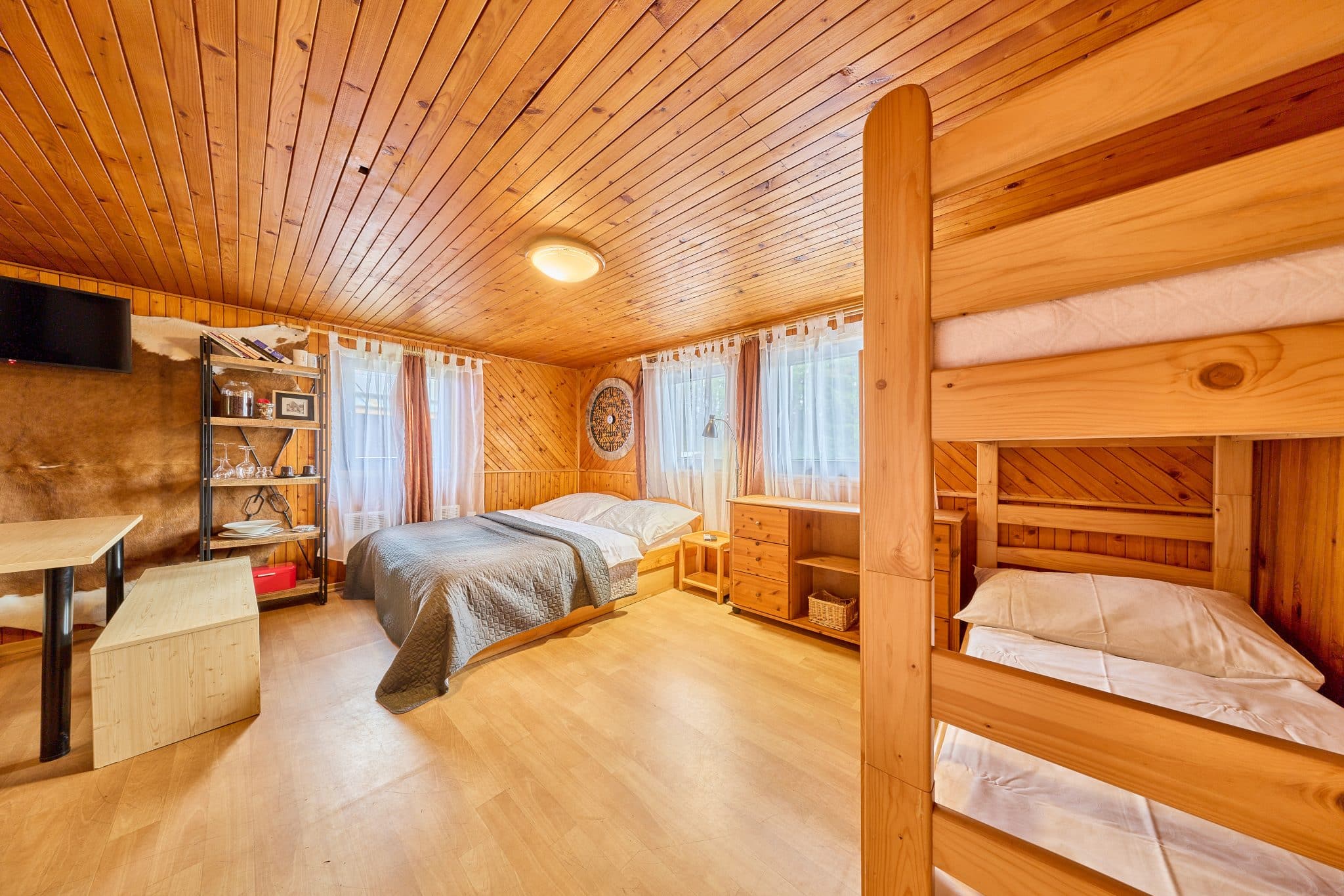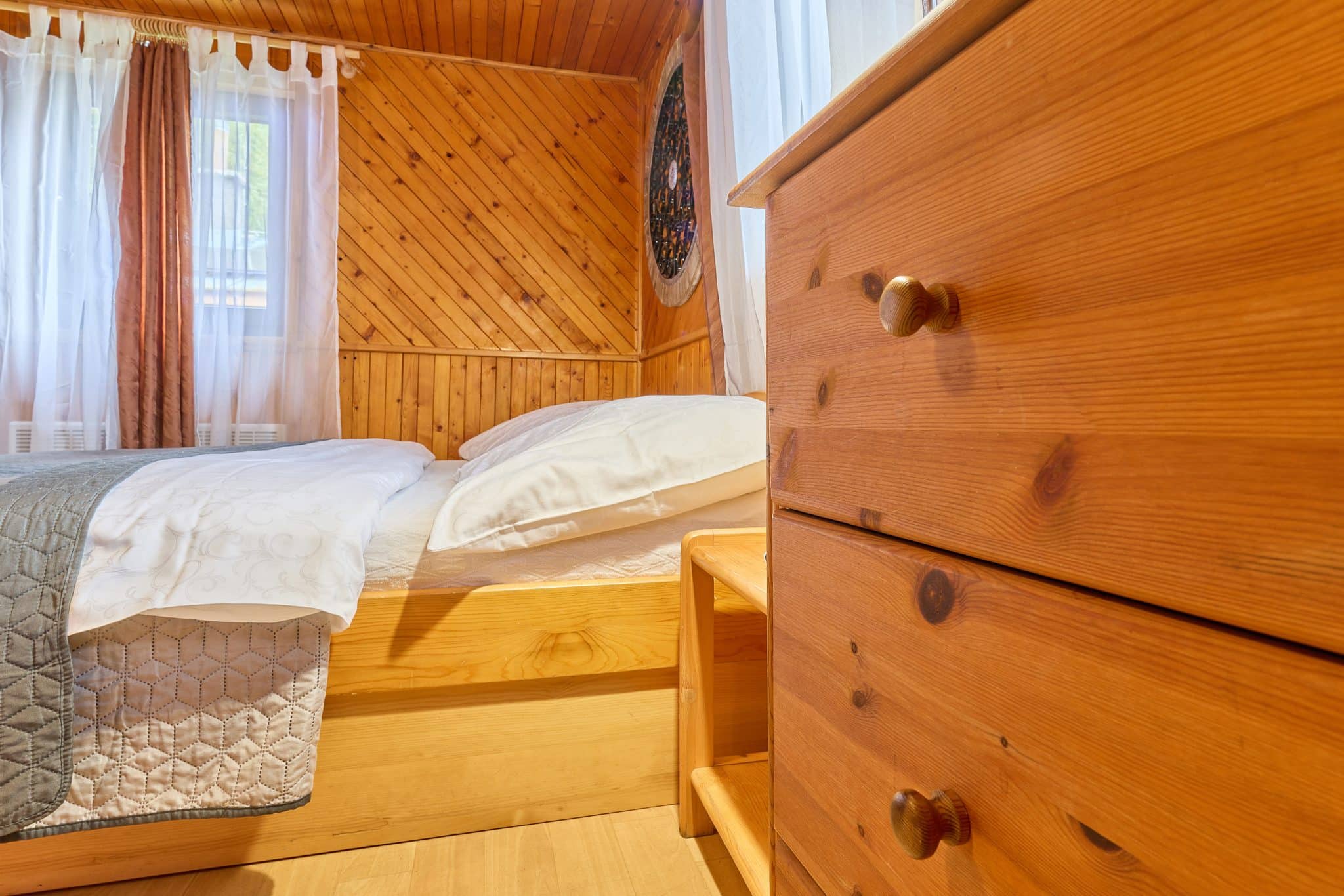 Komfortně zařízeno: obývací pokoj/ložnice s 1 x 2 lůžky nad sebou, 1x dvoulůžkem, krbovými kamny, jídelním stolem a TV (plochá obrazovka). Kuchyňský kout (2-plotýnkový vařič, toustovač/topinkovač, varná konvice, mikrovlnná trouba, elektrický kávovar). Koupelna se sprchou a WC. Elektrické topení, topení dřevem. Terasa. Zahradní nábytek, gril (přenosný), lehátka. K dispozici: Internet (WiFi, zdarma). Upozornění: Vhodné pro rodiny. Nekuřácký dům. 1 malý pes povolen.