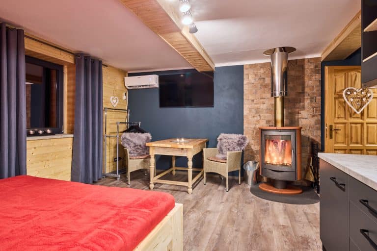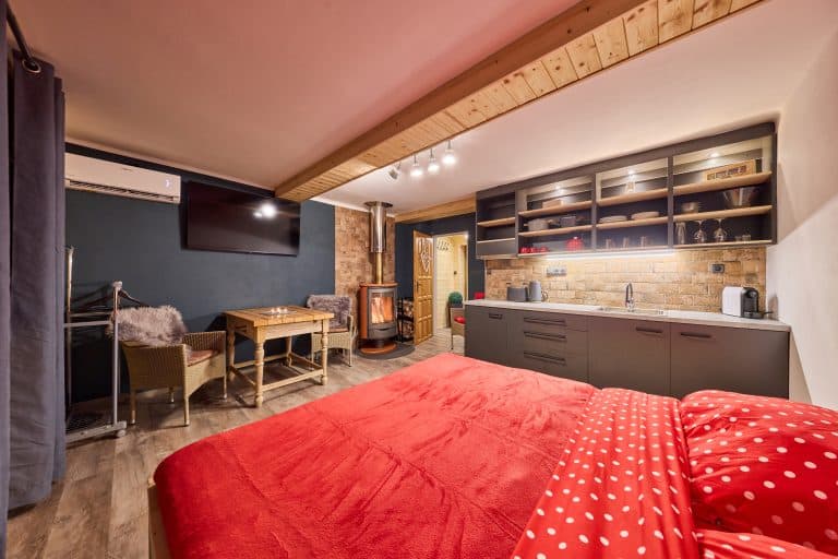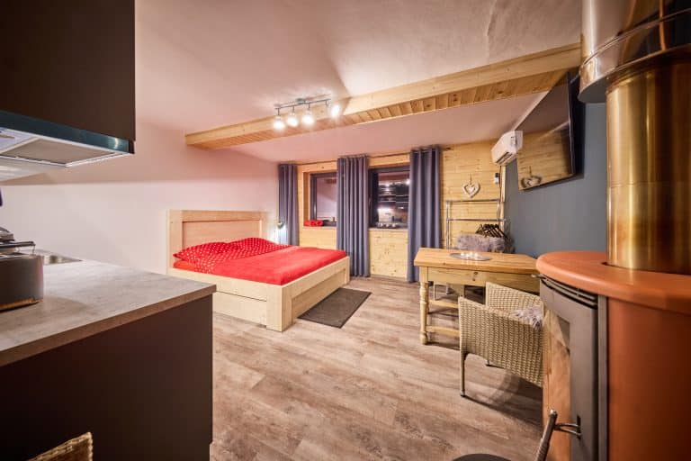 1-pokojové studio. Komfortně zařízeno: obývací pokoj/ložnice s 1x dvoulůžkem, krbovými kamny, jídelním stolem a TV (plochá obrazovka). Kuchyňský kout (2-plotýnkový vařič, toustovač/topinkovač, varná konvice, mikrovlnná trouba, elektrický kávovar). Koupelna se sprchou a WC. Elektrické topení, topení dřevem, klimatizace. Terasa. Zahradní nábytek, gril (přenosný), lehátka. K dispozici: Internet (WiFi, zdarma). Upozornění: Nekuřácký dům. 1 malý pes povolen.