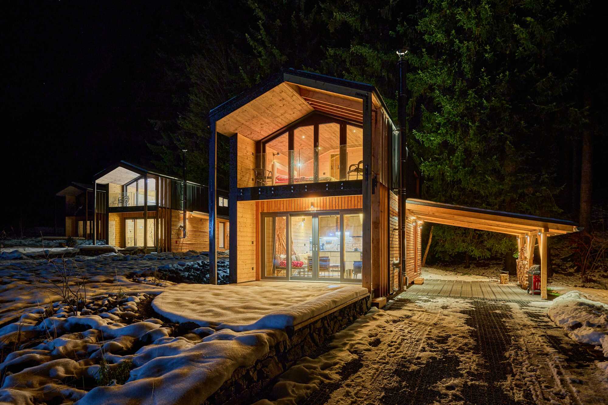 2-pokojová chata. Velmi pěkně a vkusně zařízeno: obývací pokoj/jídelna s jídelním stolem, gaučem a TV. Kuchyňský kout (2-plotýnkový vařič, trouba, toustovač/topinkovač, varná konvice, mikrovlnná trouba, elektrický kávovar, digestoř). Koupelna se sprchou/vanou a WC. Elektrické topení, podlahové topení, topení dřevem. V horním patře: 1x pokoj s 1x dvoulůžkem. 1x pokoj s 2 lůžky. Vstup na balkon. Balkon. Balkonový nábytek, gril. K dispozici: Internet (WiFi, zdarma), zabudovaný bluetooth audiosystém a centrální dotykové ovládání osvětlení a teploty pohodlně z obývacího pokoje. Zamykání na jedinečný kód. Upozornění: Vhodné pro rodiny. Nekuřácký dům.
